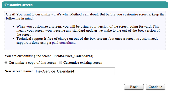 In the next step, select ‘Customize a copy of the screen’ and type in a name for the new screen for ‘New screen name:’. Click “Continue”.